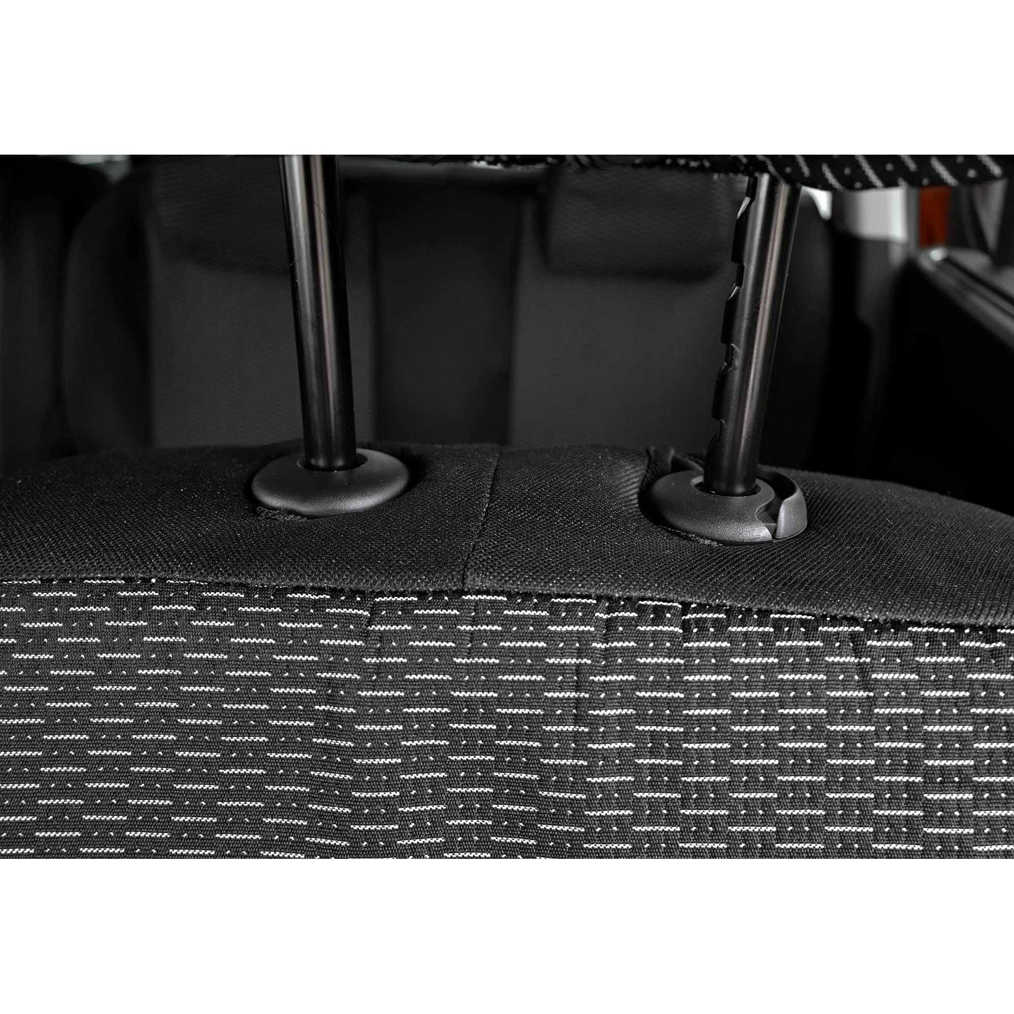 Pokrowce charakteryzują się wysoką jakością wykonania – boki są solidnie wyściełane, a część środkowa wykonana z oddychającego materiału żakardowego. Wewnętrzna laminacja z 3 mm pianki poliuretanowej zapobiega przesuwaniu się pokrowców na fotelach, zapewniając stabilność i komfort. Miejsca najbardziej narażone na zużycie wzmocniono dodatkowo trójwarstwowym materiałem z podszewką.