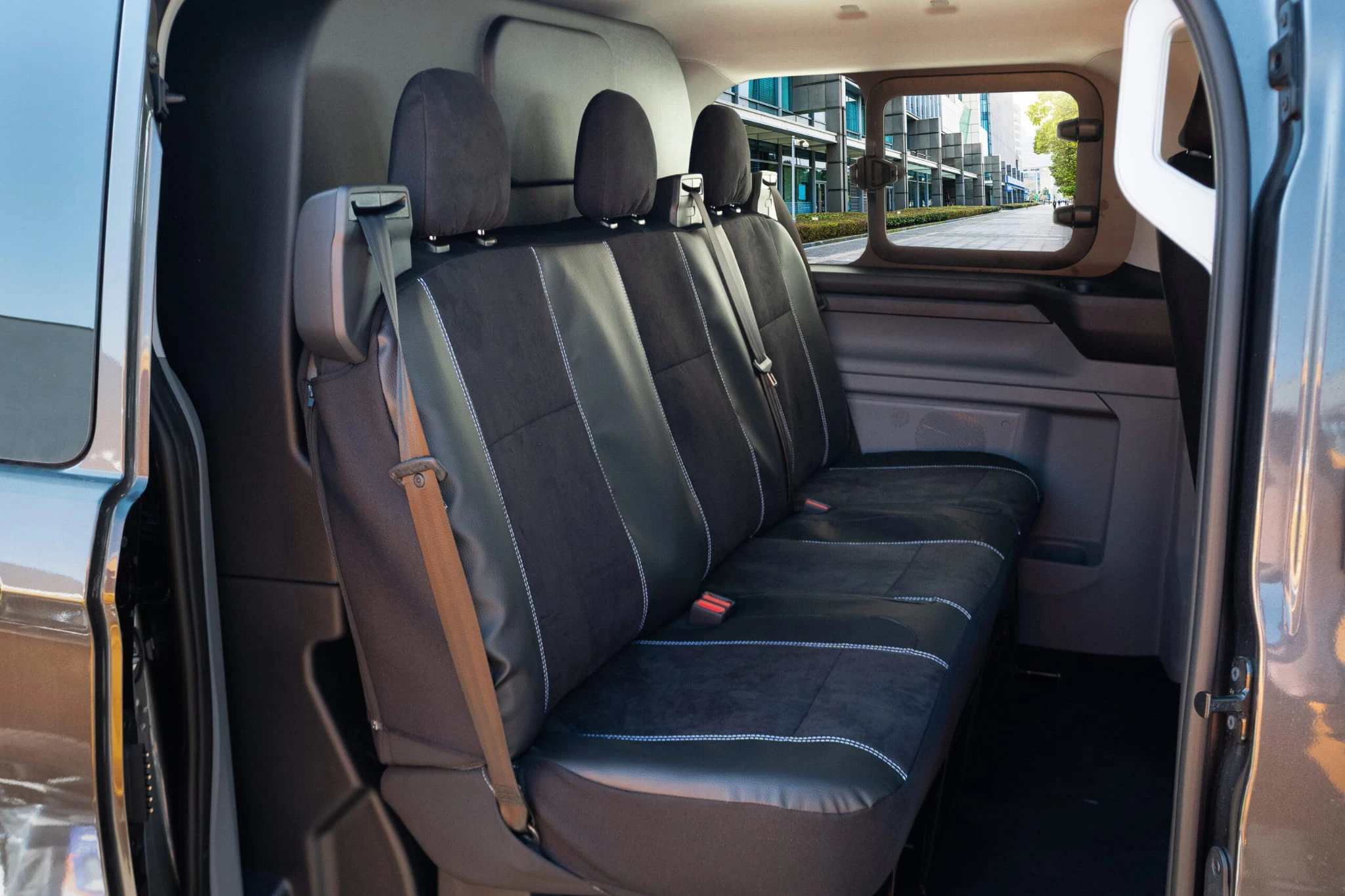Podnieś standard swojego vana dzięki linii KING – pokrowcom, które łączą rzemieślniczą precyzję z nowoczesnym, sportowym stylem. Ten zestaw został zaprojektowany specjalnie dla drugiego rzędu siedzeń najnowszej generacji Forda Transita Custom (od 2024 r.) w wersji brygadowej (Podwójna Kabina). Wyrafinowane połączenie szarego zamszu w części centralnej z czarną ekoskórą na bokach i kontrastowymi białymi przeszyciami sprawia, że wnętrze wygląda jak przygotowane na specjalne zamówienie.