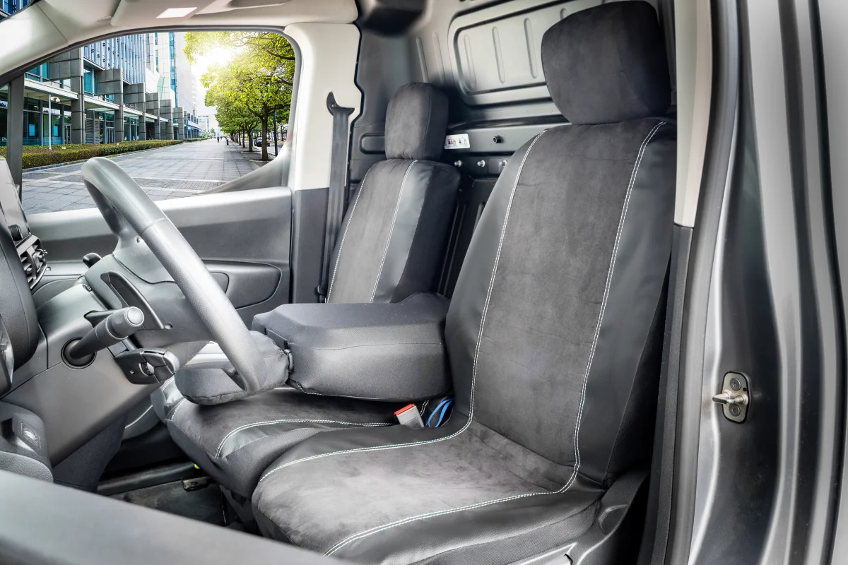 Nadaj wnętrzu swojego vana prestiżowy charakter dzięki dedykowanym pokrowcom KING. Wyjątkowe połączenie czarnej eco skóry na bokach z szarym, oddychającym zamszem na środku oraz eleganckimi Białymi przeszyciami sprawia, że kabina prezentuje się jak w aucie ekspozycyjnym.