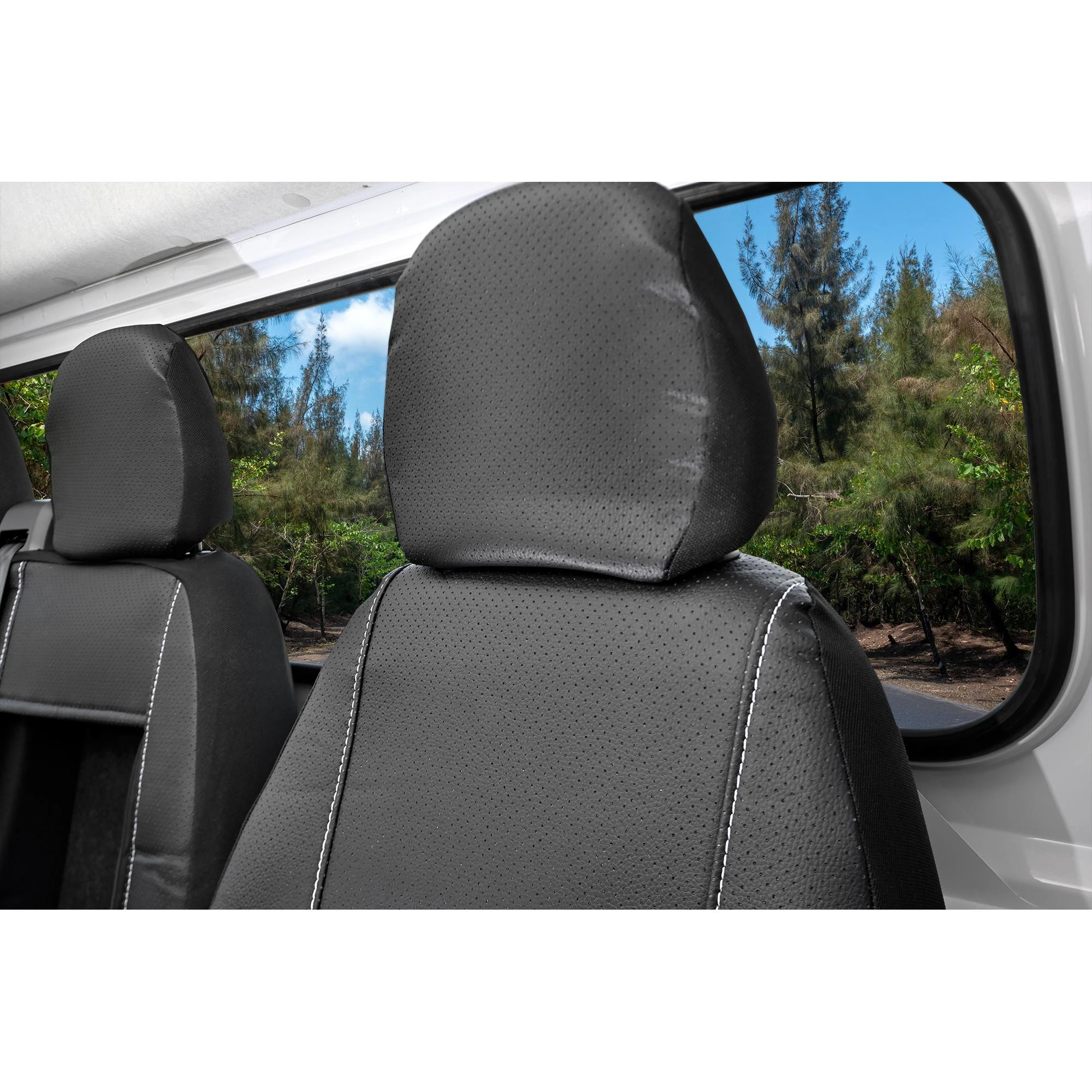 Pokrowce zostały wykonane z wysokiej jakości oddychającej eco skóry w głębokim czarnym kolorze. Gładka struktura materiału nie tylko świetnie się prezentuje, ale jest również niezwykle łatwa w utrzymaniu czystości – większość zabrudzeń usuniesz błyskawicznie przy użyciu wilgotnej szmatki. Dzięki wzmocnionemu spodowi i precyzyjnemu krojowi, produkt idealnie przylega do foteli, eliminując problem przesuwania się materiału.