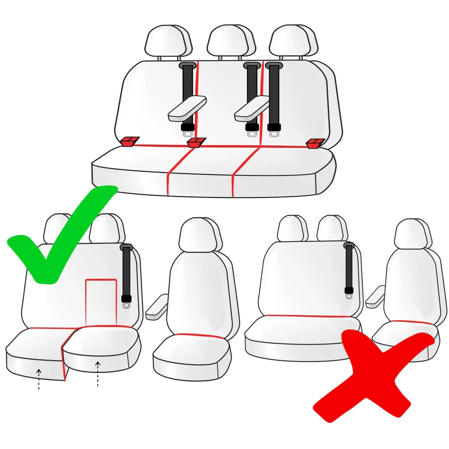 - 1x komplet pokrowców na podwójny fotel pasażera (oparcie ze stolikiem + dzielone siedzisko)