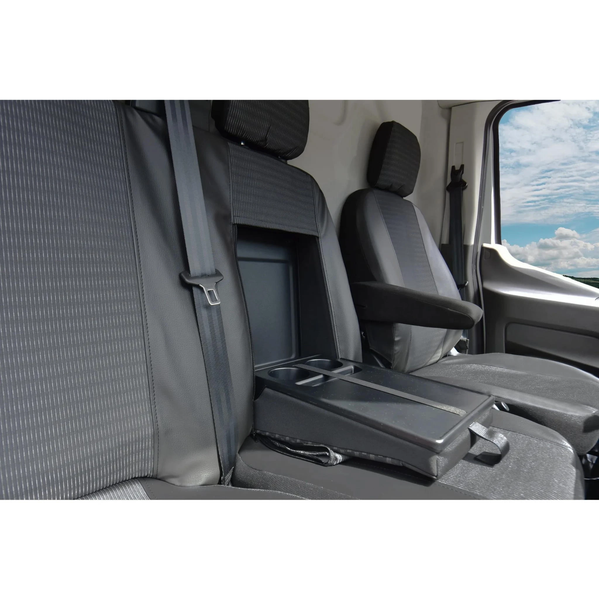 - Fotel kierowcy: Pojedynczy, z dopasowanym pokrowcem na podłokietnik i przygotowaniem pod boczną poduszkę powietrzną.