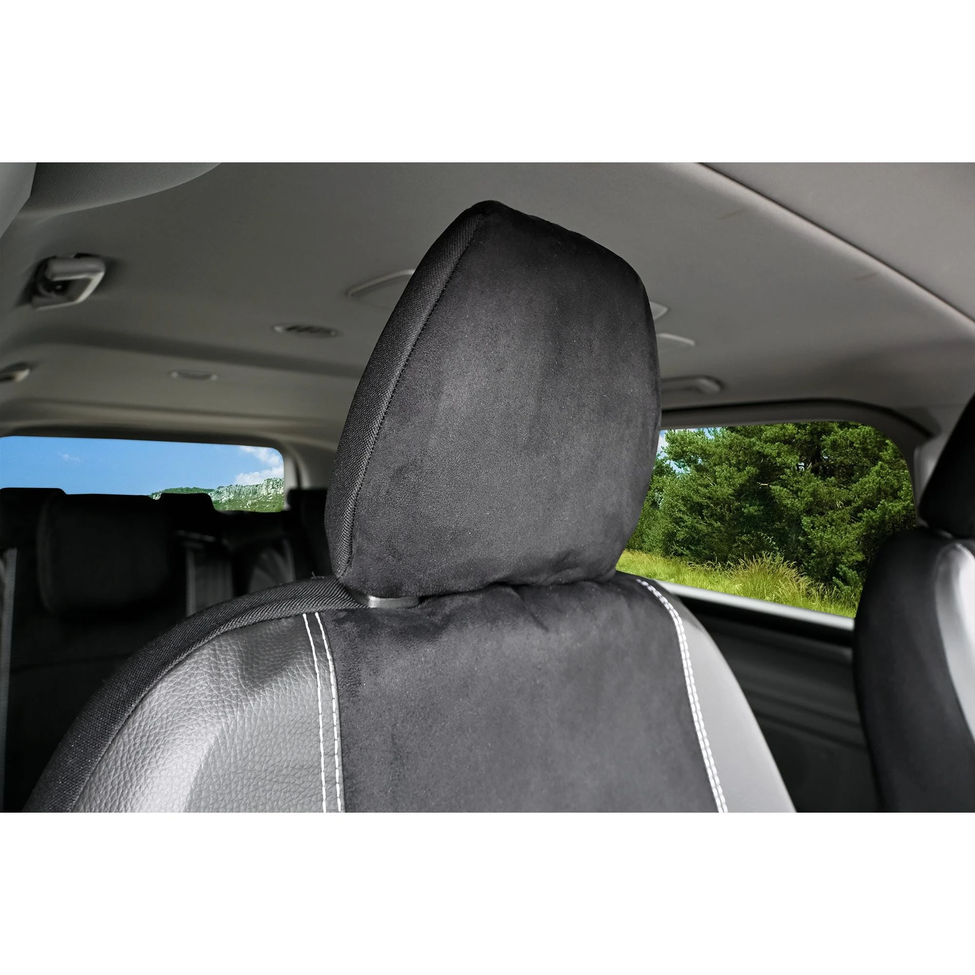 Linia KING to połączenie luksusowego designu z bezkompromisową wytrzymałością. Ten zestaw pokrowców został zaprojektowany specjalnie dla przedniego rzędu siedzeń modelu Ford Tourneo / Transit Custom II (od 2024 r.) w układzie 1+1 (dwa pojedyncze fotele). Wykonane z eleganckiej kombinacji czarnej ekoskóry na bokach oraz miękkiego, szarego zamszu w części środkowej, pokrowce te nadają wnętrzu unikalny, sportowy charakter, podkreślony stylowymi białymi przeszyciami.