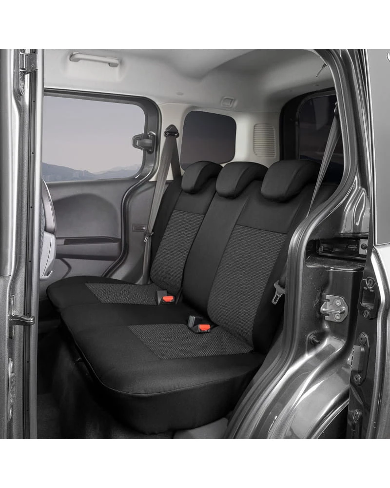Zestaw zawiera: 2 pokrowce na przednie fotele (pokrowce przystosowane do podłokietników zamontowanych w bocznych częściach oparcia oraz do stolików w tylnej części oparcia), pokrowiec na tylną kanapę z dzielonym siedziskiem i oparciem, 1 pokrowiec na podłokietnik, 5 pokrowców na zagłówki