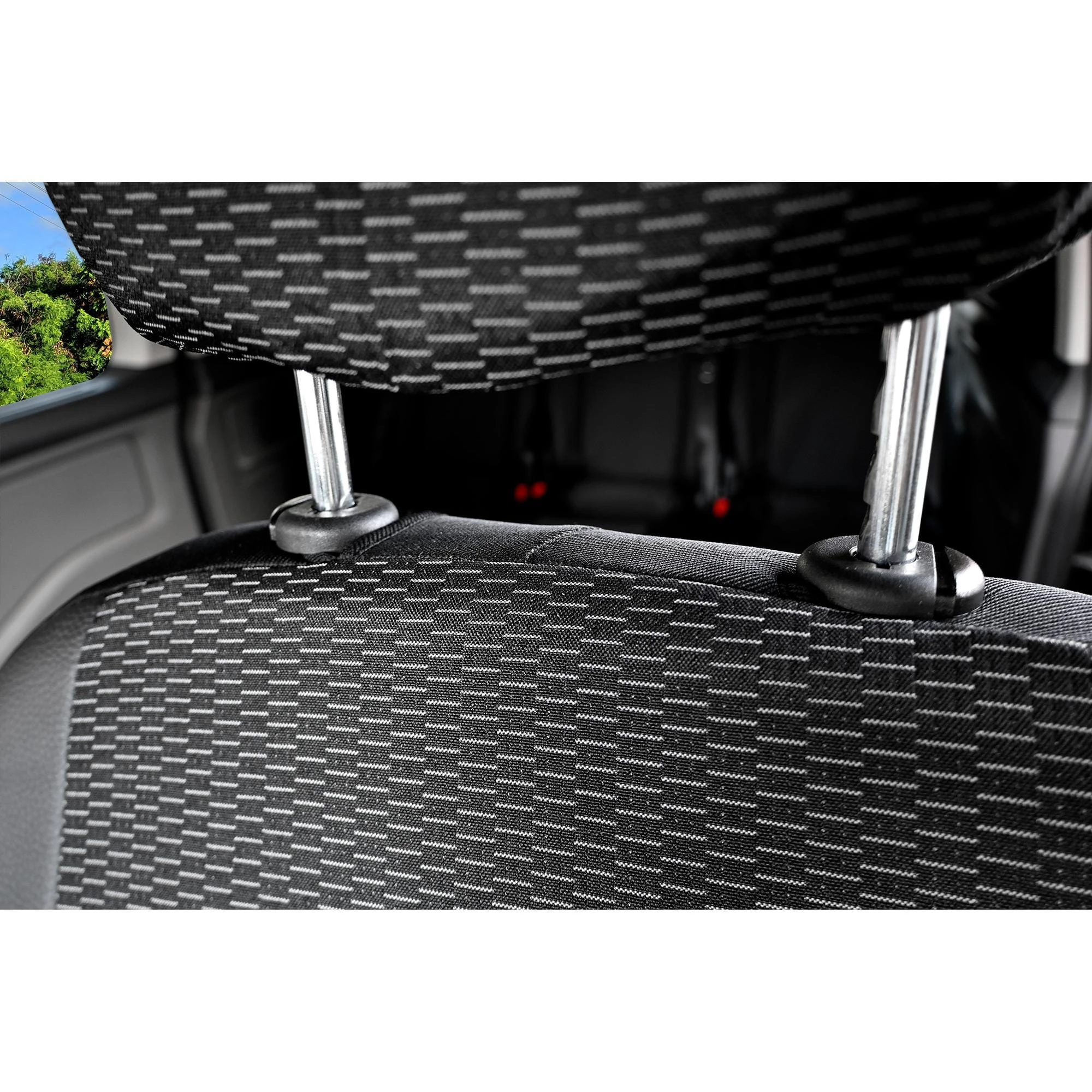 - Pierwszy rząd: Dopasowane pokrowce na fotel kierowcy oraz pasażera (układ 1+1).