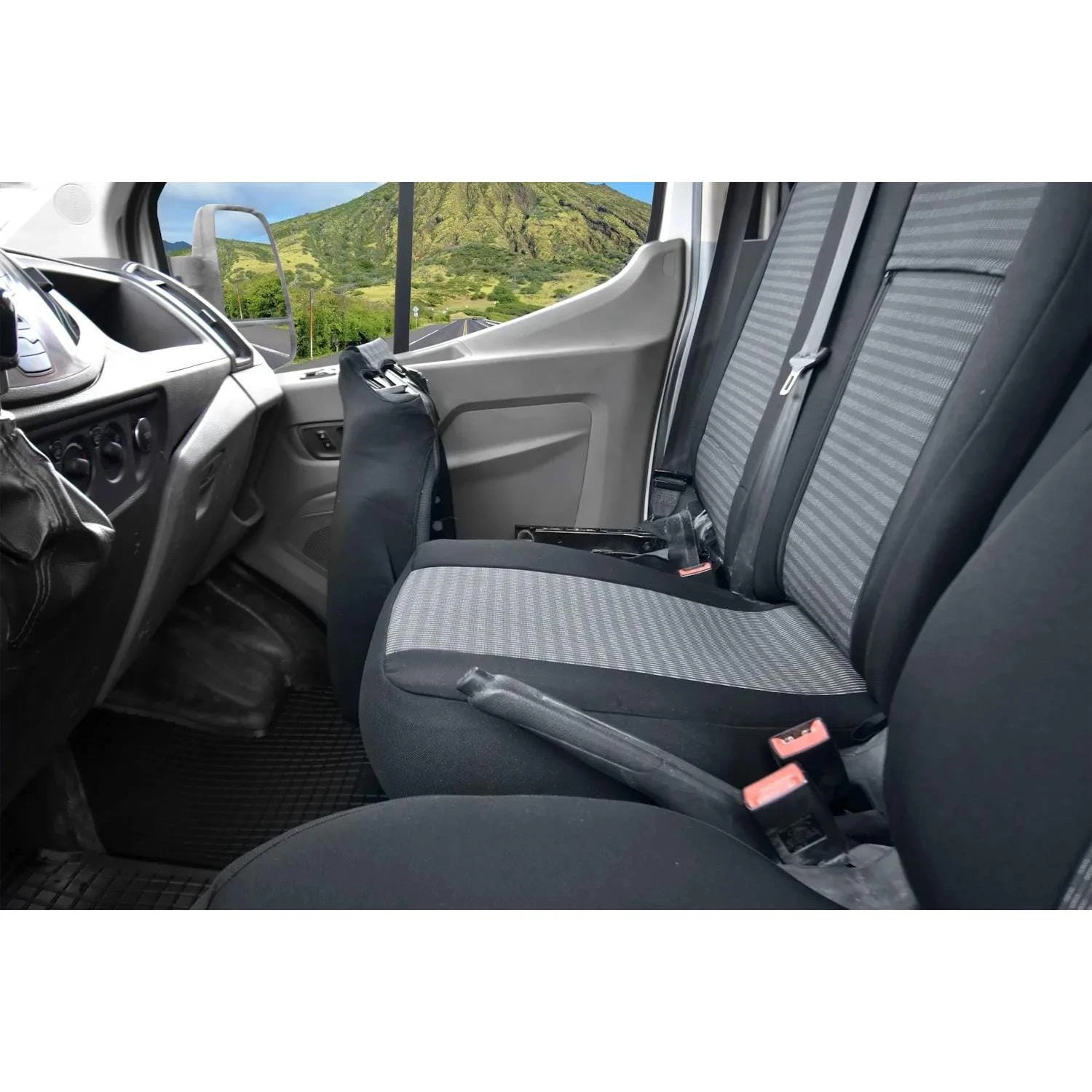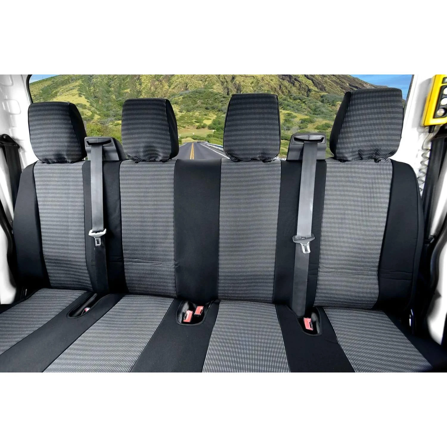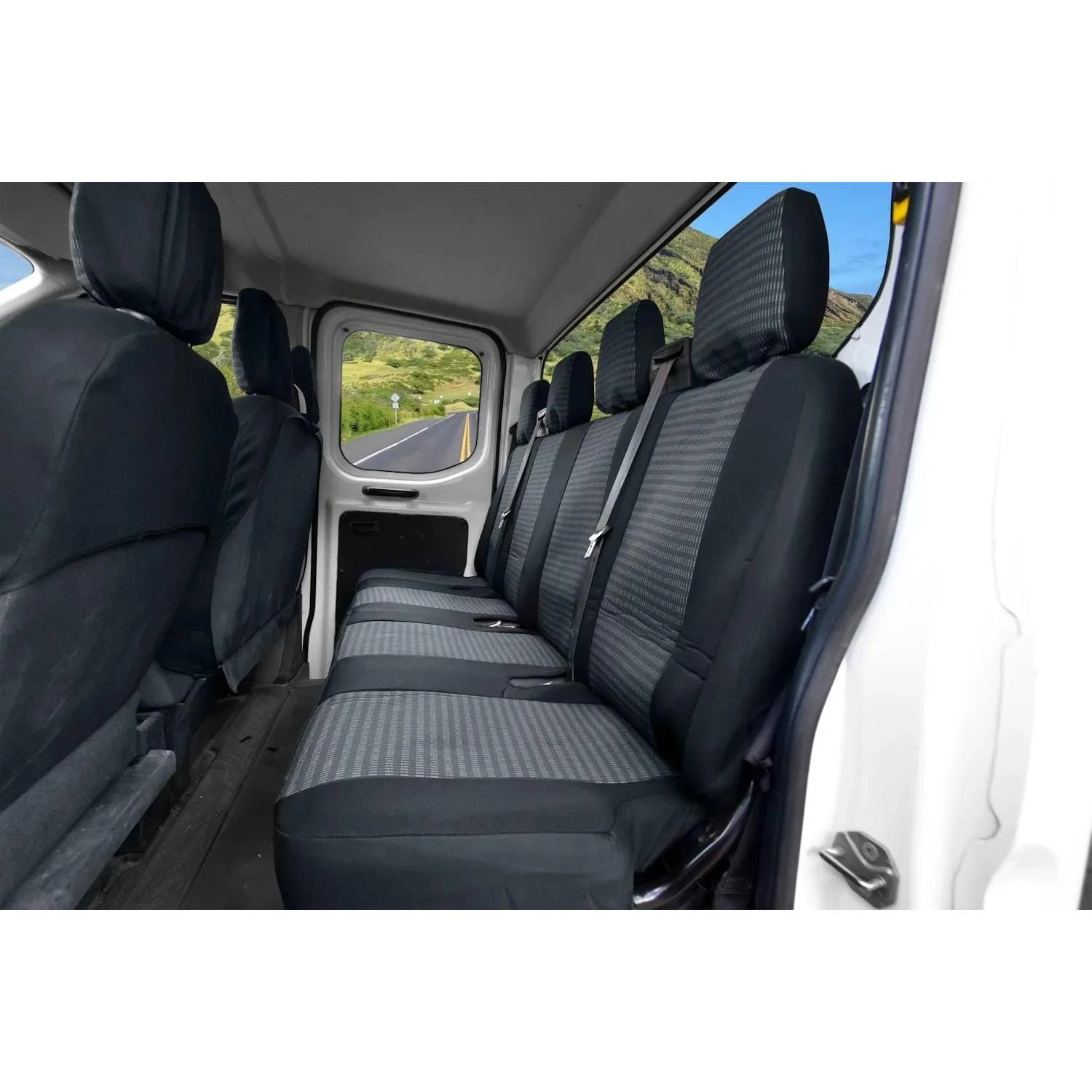 Uwaga: Produkt nie pasuje do modelu Transit Custom. Przed zakupem należy sprawdzić umiejscowienie pasów bezpieczeństwa w drugim rzędzie – pokrowce pasują wyłącznie na całe, niepodzielone kanapy. Kolor produktu może się różnić w zależności od ustawień ekranu.