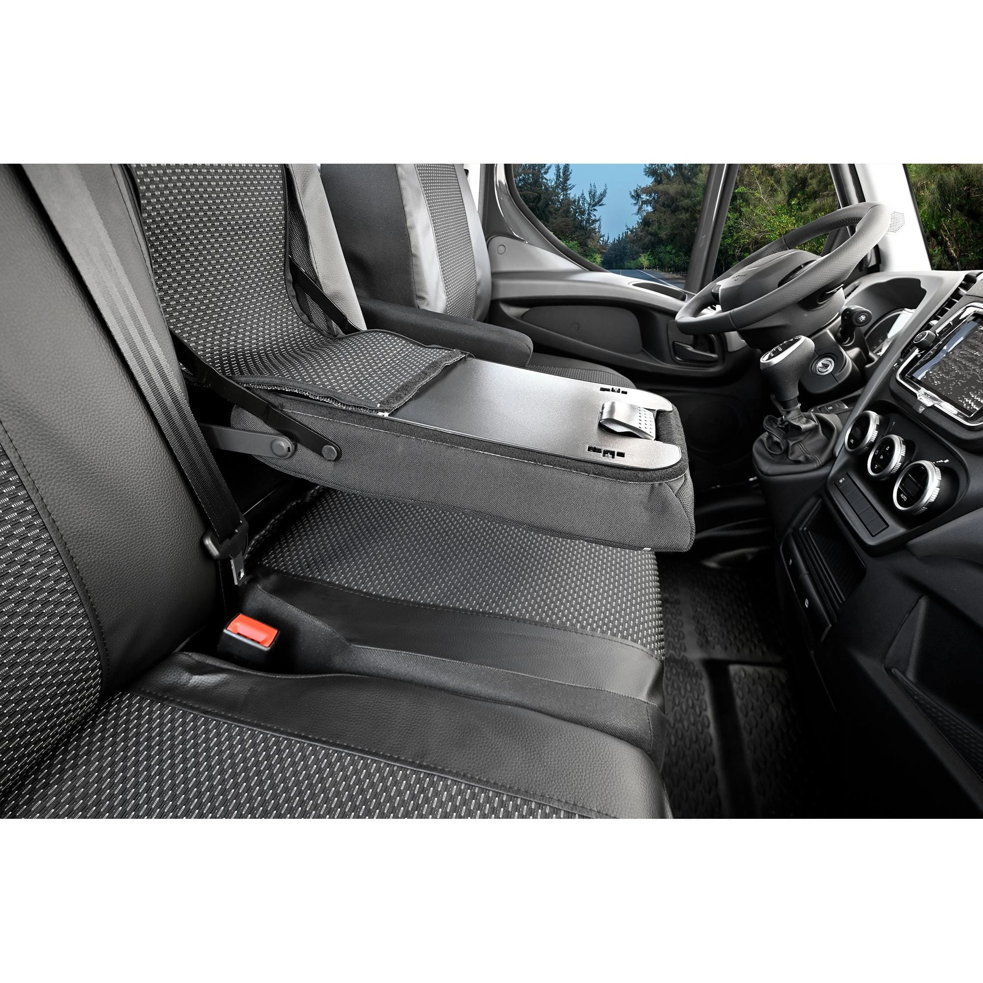 - Kanapa pasażera: Podwójne oparcie wyposażone w otwór na rozkładany stolik oraz dwa oddzielne pokrowce na podnoszone siedziska (dwie sekcje).