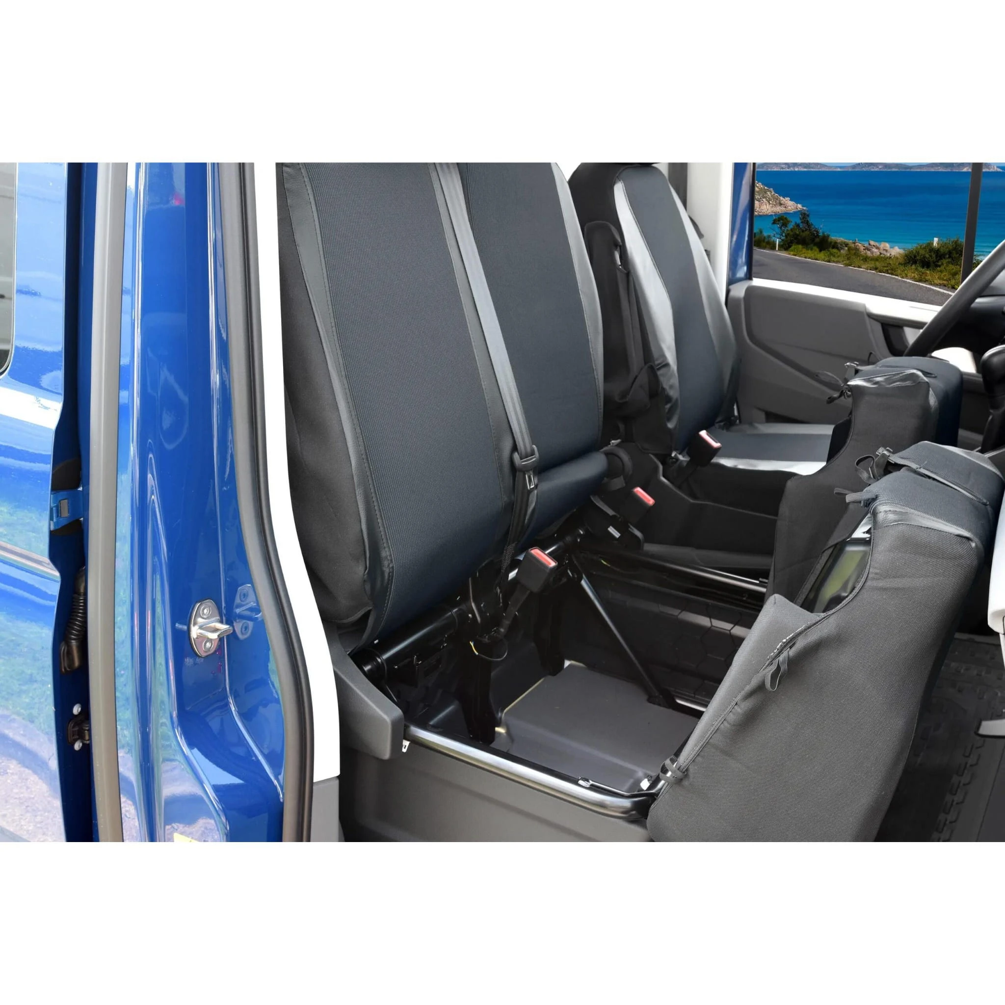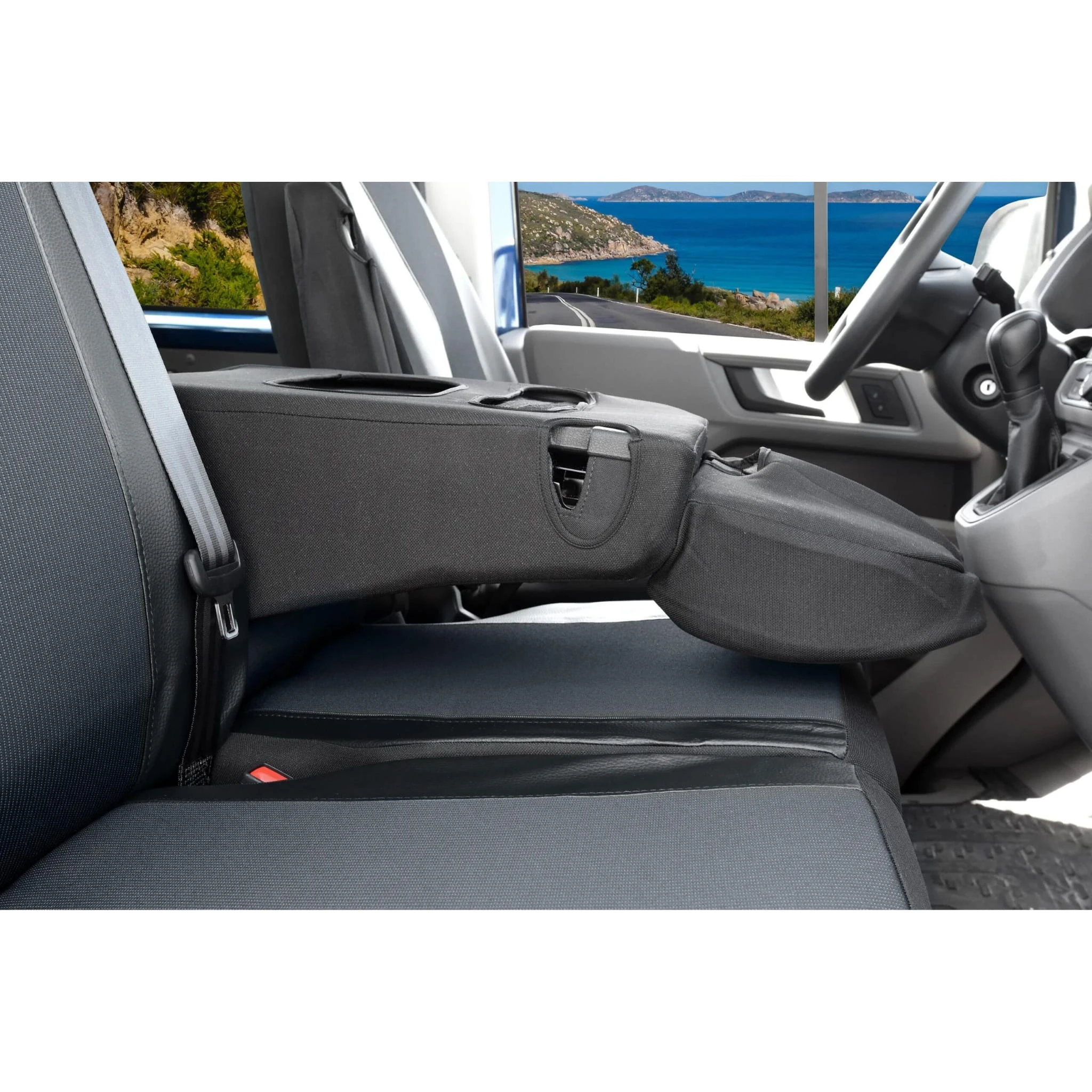 - Kanapa pasażera (2-osobowa): Pokrowiec oparcia jest dzielony, co umożliwia swobodne korzystanie z fabrycznego stolika/podłokietnika ukrytego w oparciu.