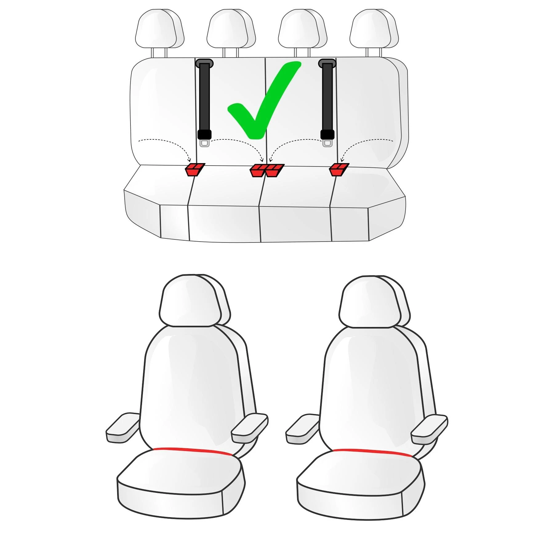 - Rząd I (1+1): Dwa pojedyncze fotele (kierowcy i pasażera). Pokrowce pasują do wersji z podłokietnikami oraz bez nich. Przystosowane do oparć ze stolikiem lub bez stolika.