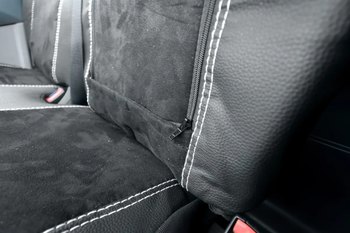 Seria KING to nie tylko wygląd, ale przede wszystkim trwałość. Zastosowany zamsz jest materiałem oddychającym i wodoodpornym, co drastycznie podnosi komfort pracy, zwłaszcza podczas długich tras. Dzięki wzmocnionej konstrukcji spodu pokrowce idealnie przylegają do foteli, nie zsuwają się i skutecznie chronią oryginalną tapicerkę przed wycieraniem i zabrudzeniami.