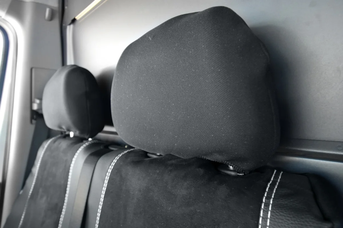 Podnieś standard wnętrza swojego vana dzięki prestiżowym pokrowcom na siedzenia z serii KING. Wyjątkowe połączenie wytrzymałej, czarnej eco skóry na bokach z eleganckim, szarym zamszem w części centralnej nadaje kabinie sportowy i nowoczesny charakter. Całość dopełniają kontrastowe białe przeszycia, które przyciągają wzrok i podkreślają unikalny styl Twojego pojazdu.