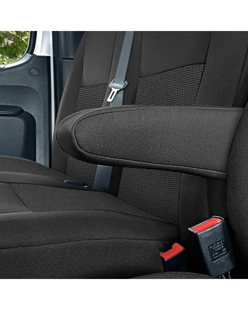 Zestaw zawiera: 2 pokrowiec na fotel kierowcy (pokrowiec kierowcy przystosowany do podłokietnika zamontowanego w bocznej części oparcia), pokrowiec na podwójny fotel pasażerów bez dzieleń, pokrowiec na podłokietnik, 3 pokrowce na zagłówki