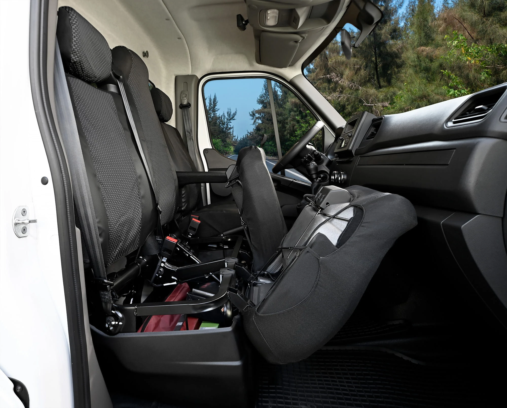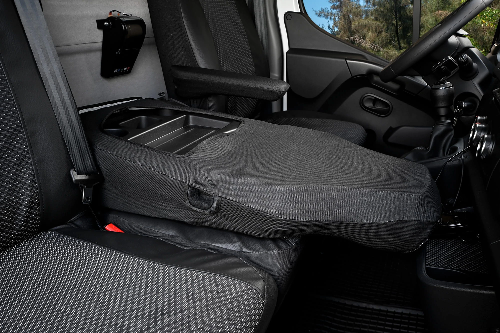 - Konfiguracja 1+2: Zestaw przeznaczony na fotel kierowcy oraz dzieloną kanapę pasażera z dostępem do schowków.