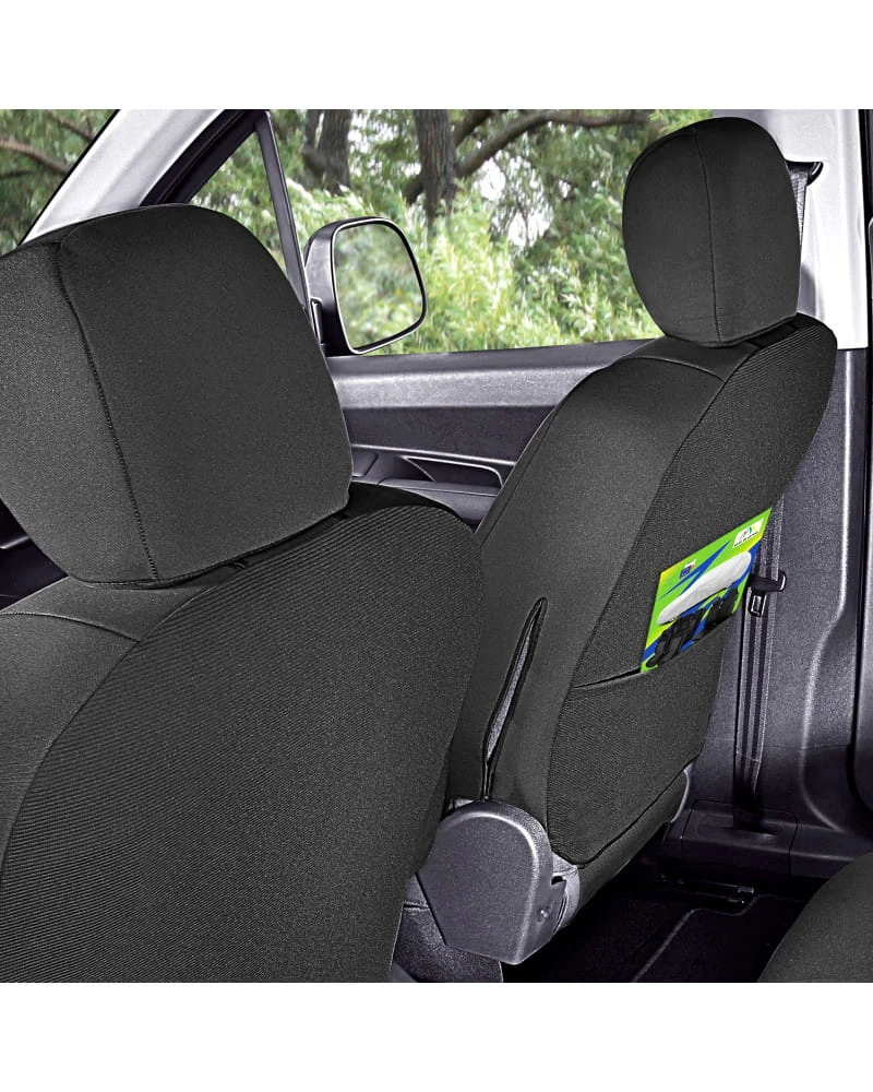 - 2x pokrowce na przednie fotele (pokrowce przystosowane do podłokietników zamontowanych w bocznych częściach oparcia, pokrowiec na fotel pasażera wyposażony w kieszeń)
