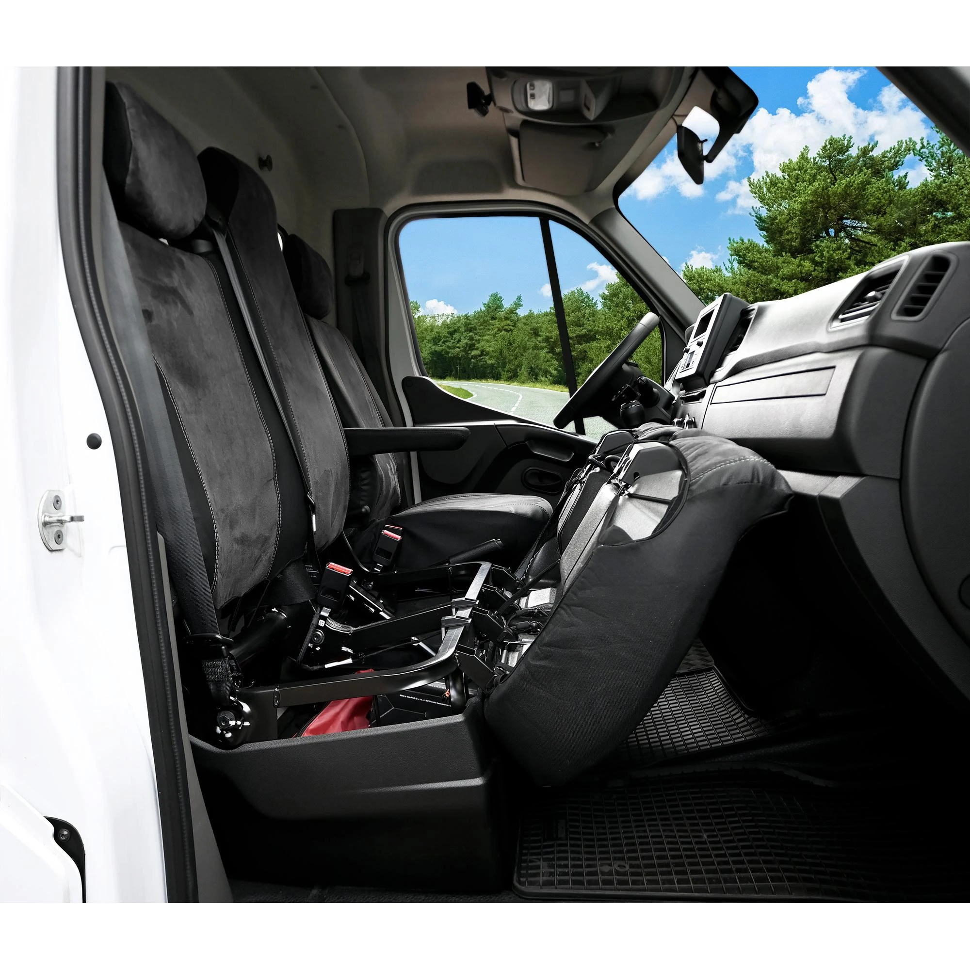 - Układ siedzeń: 3 miejsca (1+2) – fotel kierowcy i podwójna kanapa pasażerów.