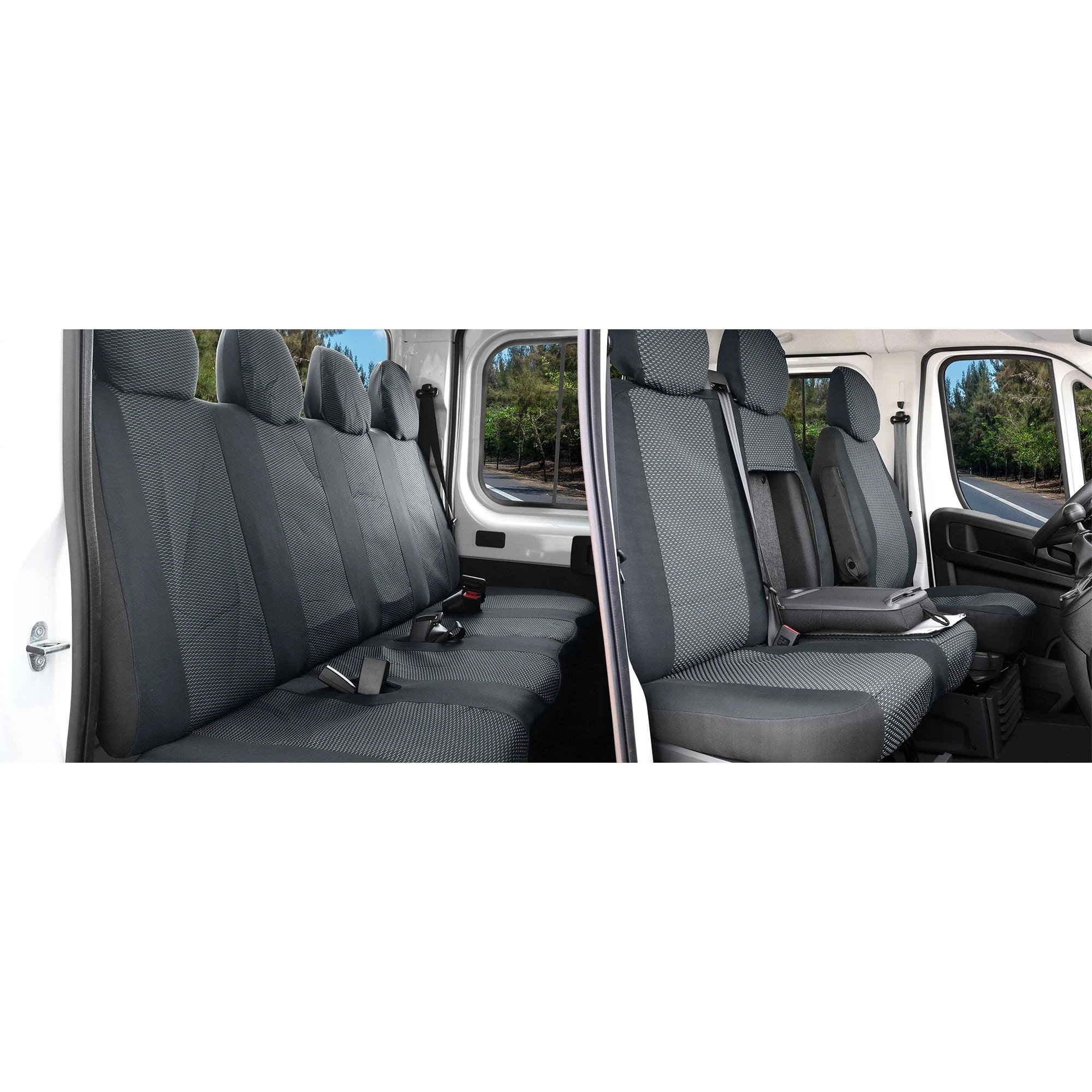 - Pierwszy rząd: Pojedynczy fotel kierowcy oraz podwójna kanapa pasażerów. Pokrowiec oparcia pasażera jest uniwersalny – pasuje zarówno do wersji ze składanym stolikiem, jak i bez niego.
