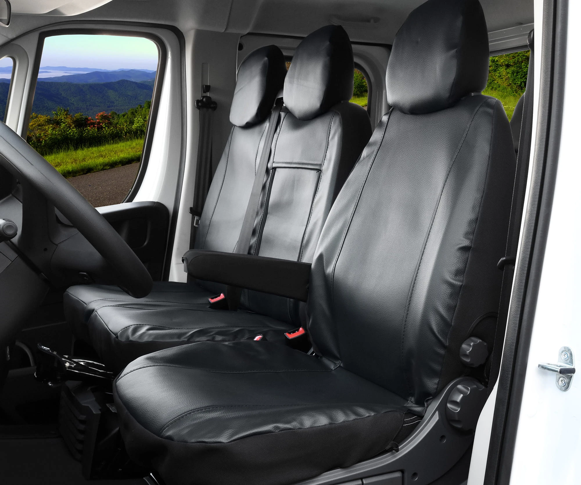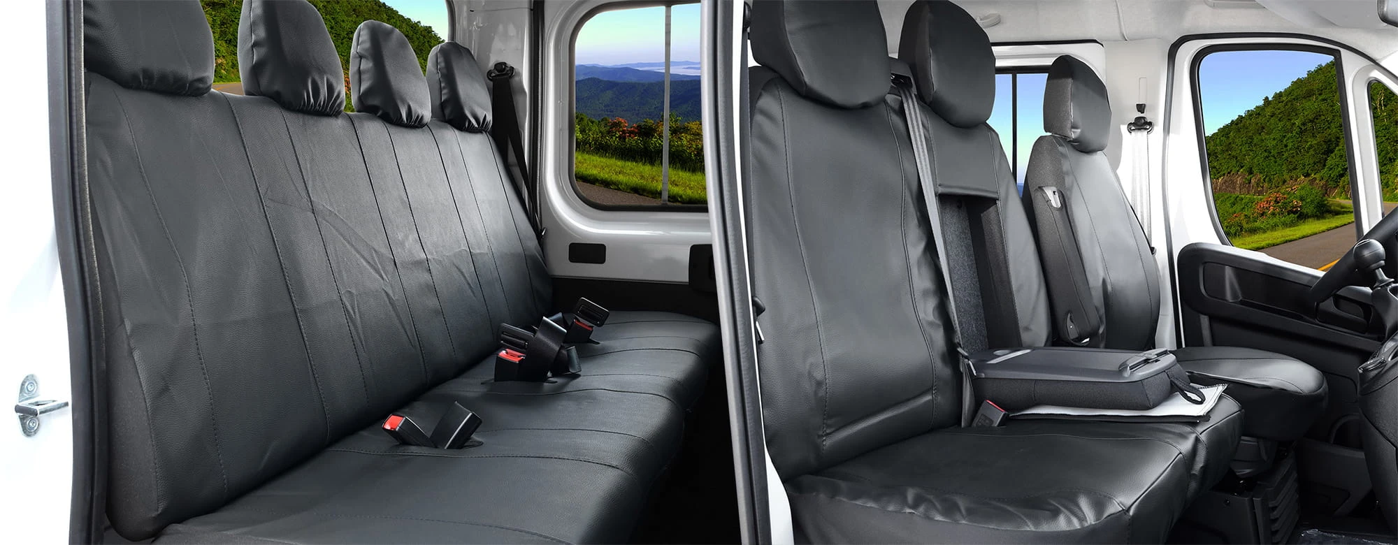 - Pierwszy rząd (1+2): Obejmuje pojedynczy fotel kierowcy (z miejscem na podłokietnik) oraz podwójną kanapę pasażera. Pokrowiec przedni jest uniwersalnie przystosowany do wersji z rozkładanym stolikiem w oparciu lub bez niego.