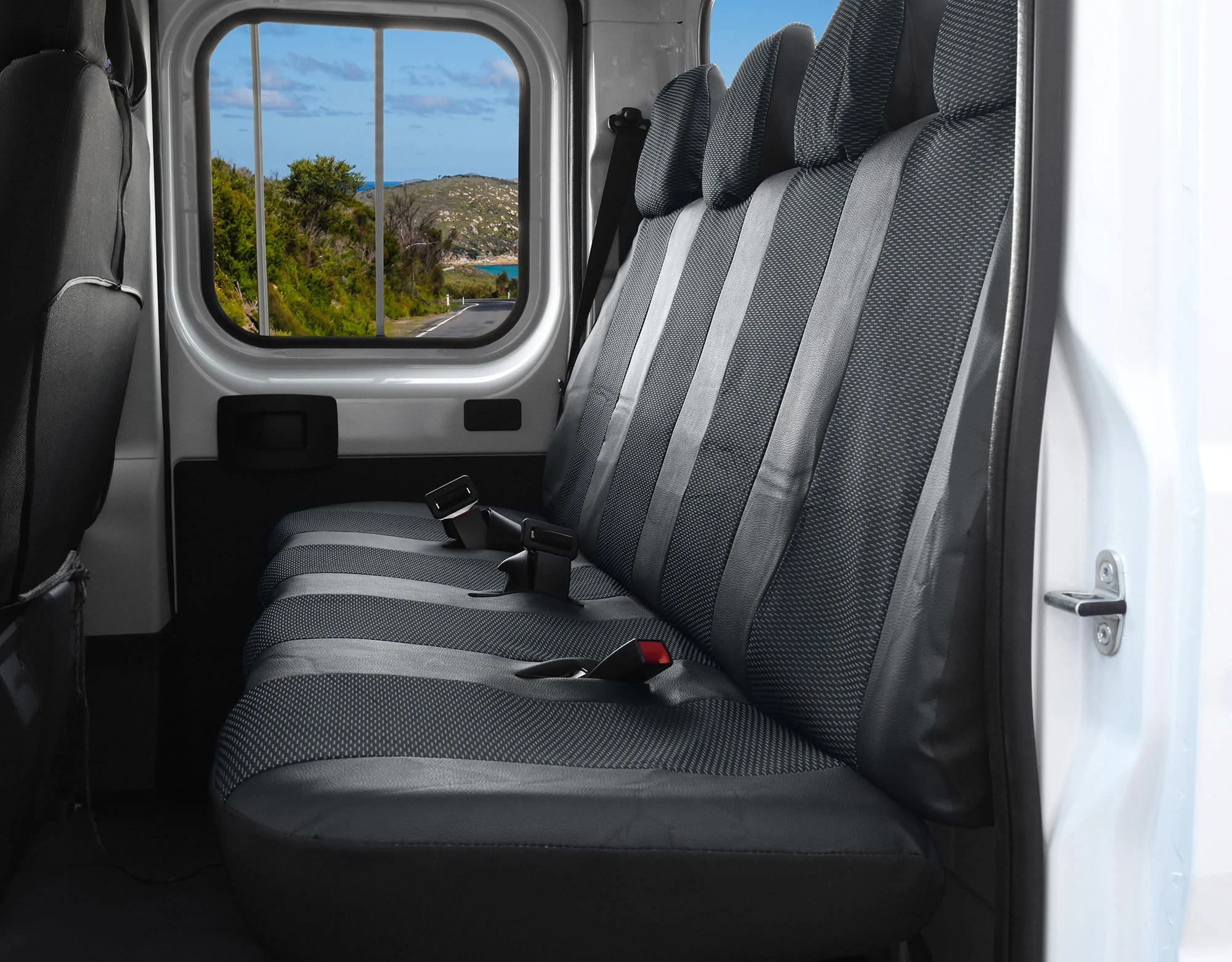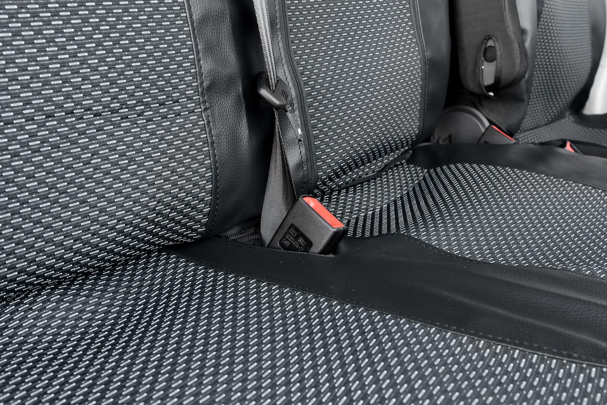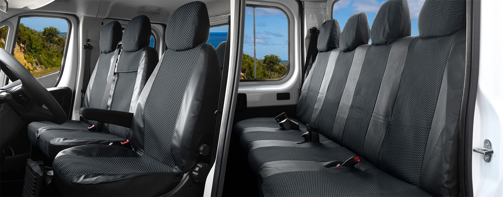 - Pierwszy rząd: Pojedynczy fotel kierowcy oraz podwójna kanapa pasażerów. Pokrowiec oparcia pasażera jest przystosowany do wersji z rozkładanym stolikiem, jak i bez niego.