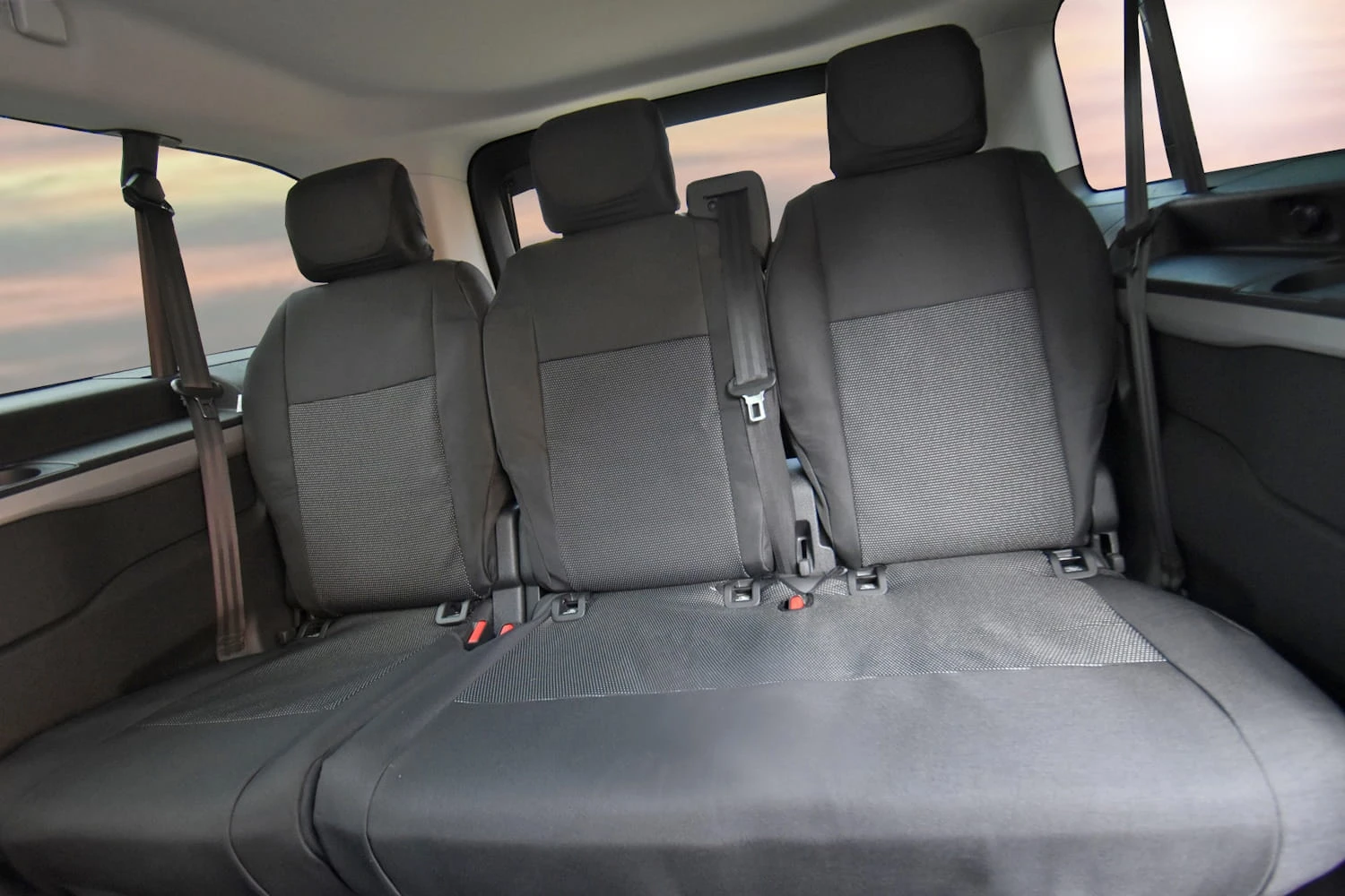 Zestaw zawiera: pokrowiec na potrójną kanapę pasażerów składającą się z pojedynczego fotela i podwójnego fotela z dzielonym oparciem, 3 pokrowce na zagłówki