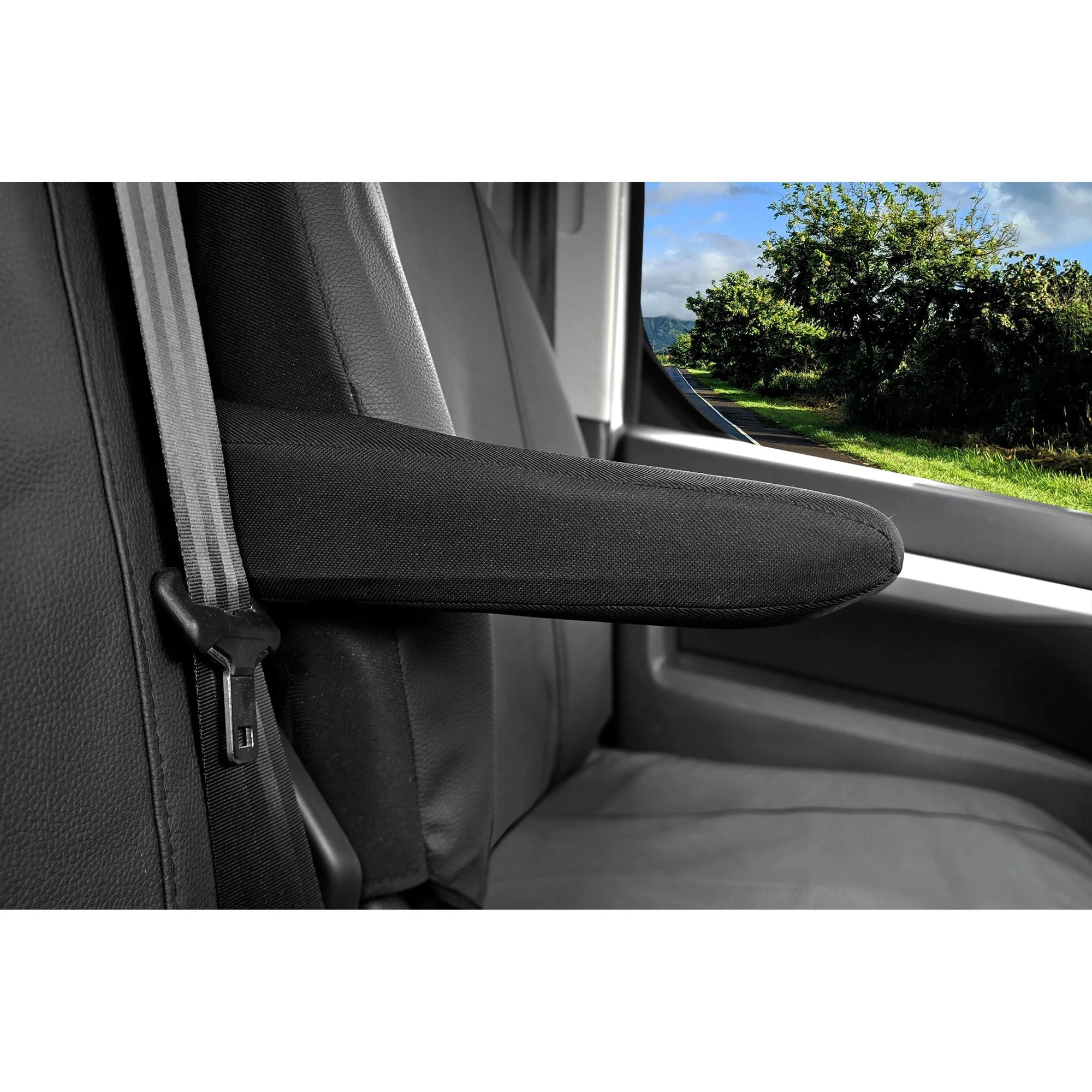 - Podłokietnik: Pokrowiec fotela kierowcy posiada fabryczny otwór oraz dedykowaną osłonę na jeden podłokietnik.