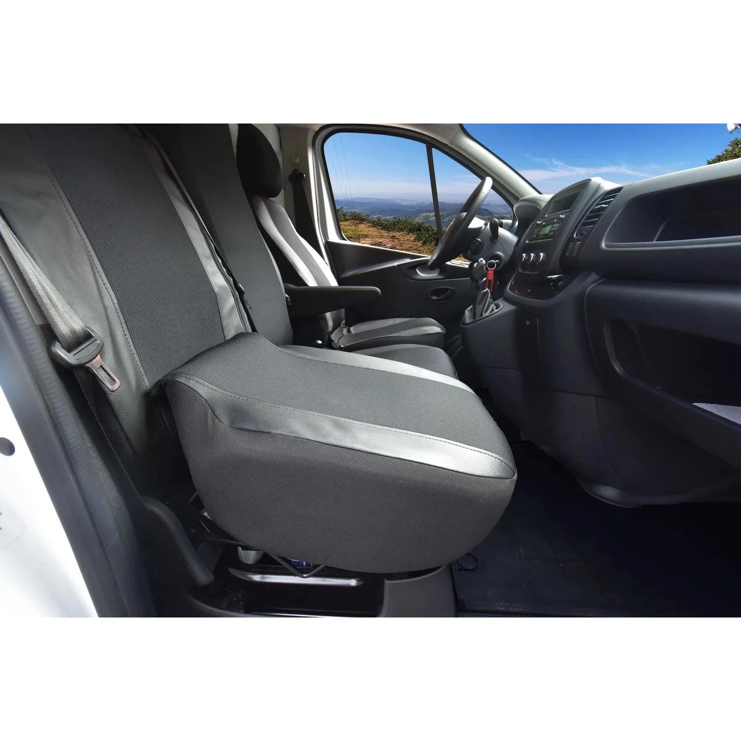 Linia VIVA to propozycja dla profesjonalistów, którzy w swoim Oplu Vivaro poszukują idealnego balansu między stylem a funkcjonalnością. Wykonane z wysokiej jakości czarnej eco-skóry na bokach oraz wytrzymałej szarej tkaniny w części środkowej, pokrowce te nadają wnętrzu nowoczesny, "salonowy" wygląd, jednocześnie chroniąc tapicerkę przed trudami codziennej pracy.