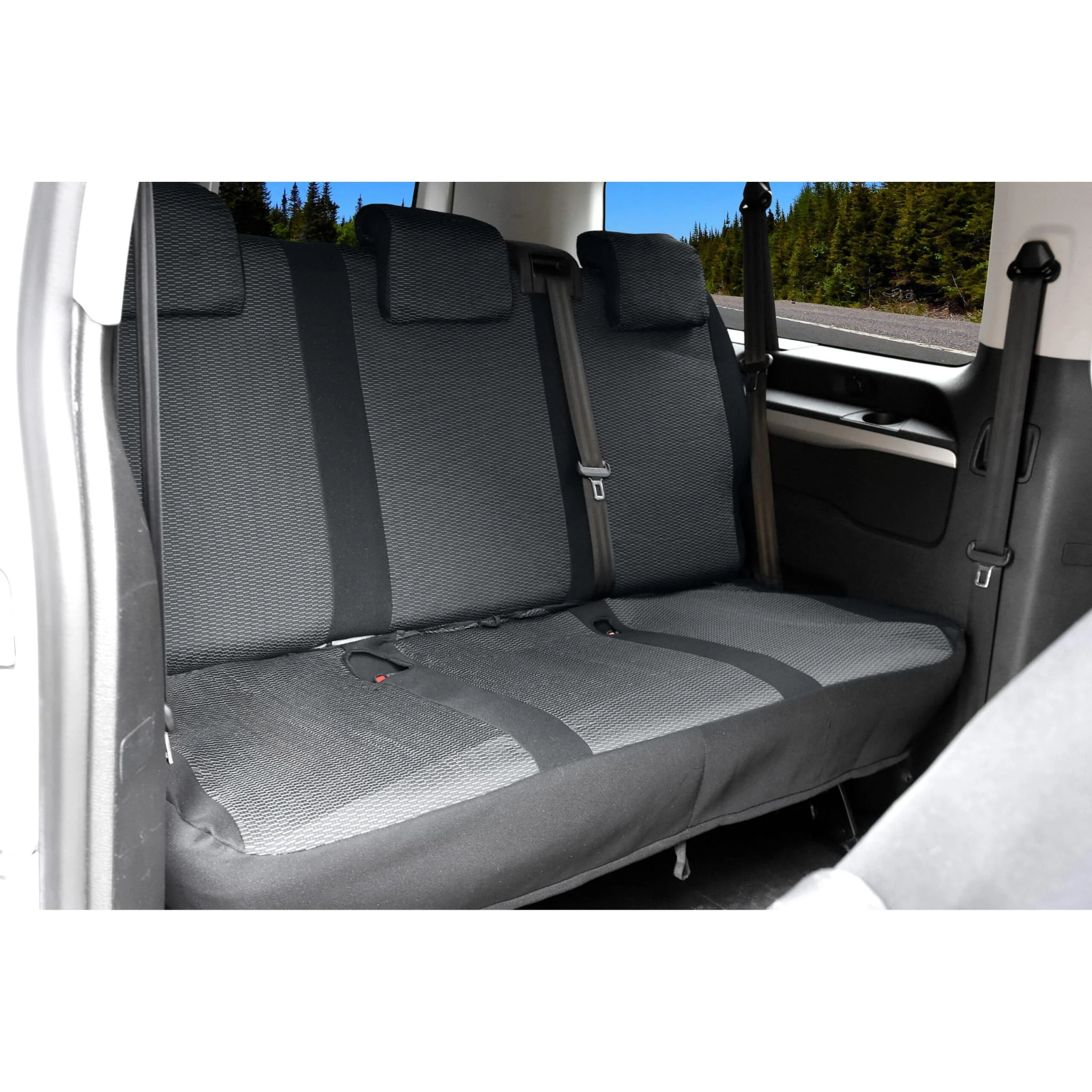 - Rząd II i III (Tył): Kanapy w systemie 2+1 – pokrowce są precyzyjnie docięte na sekcję dwuosobową oraz niezależny, pojedynczy fotel w każdym rzędzie.