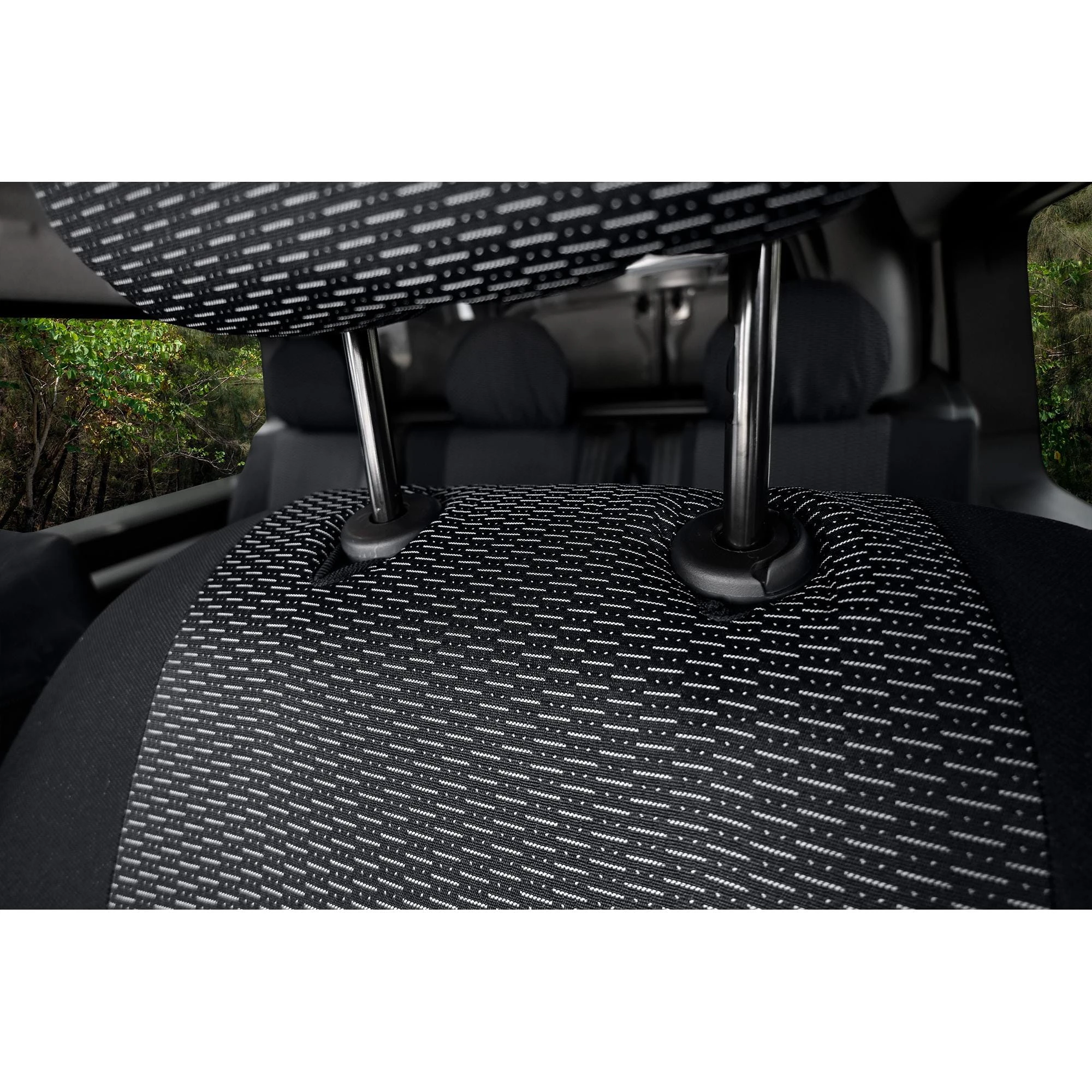 - Rząd II (Tył 1+1+1): Pokrowce na trzy pojedyncze fotele pasażerskie, uwzględniające otwory na dwa podłokietniki znajdujące się pośrodku.