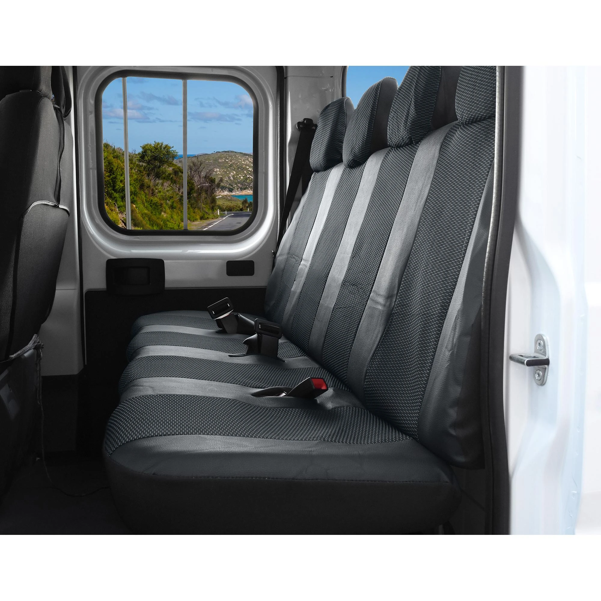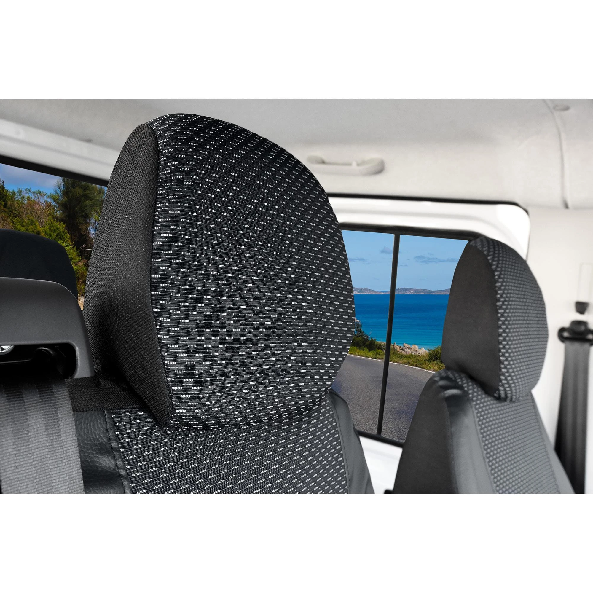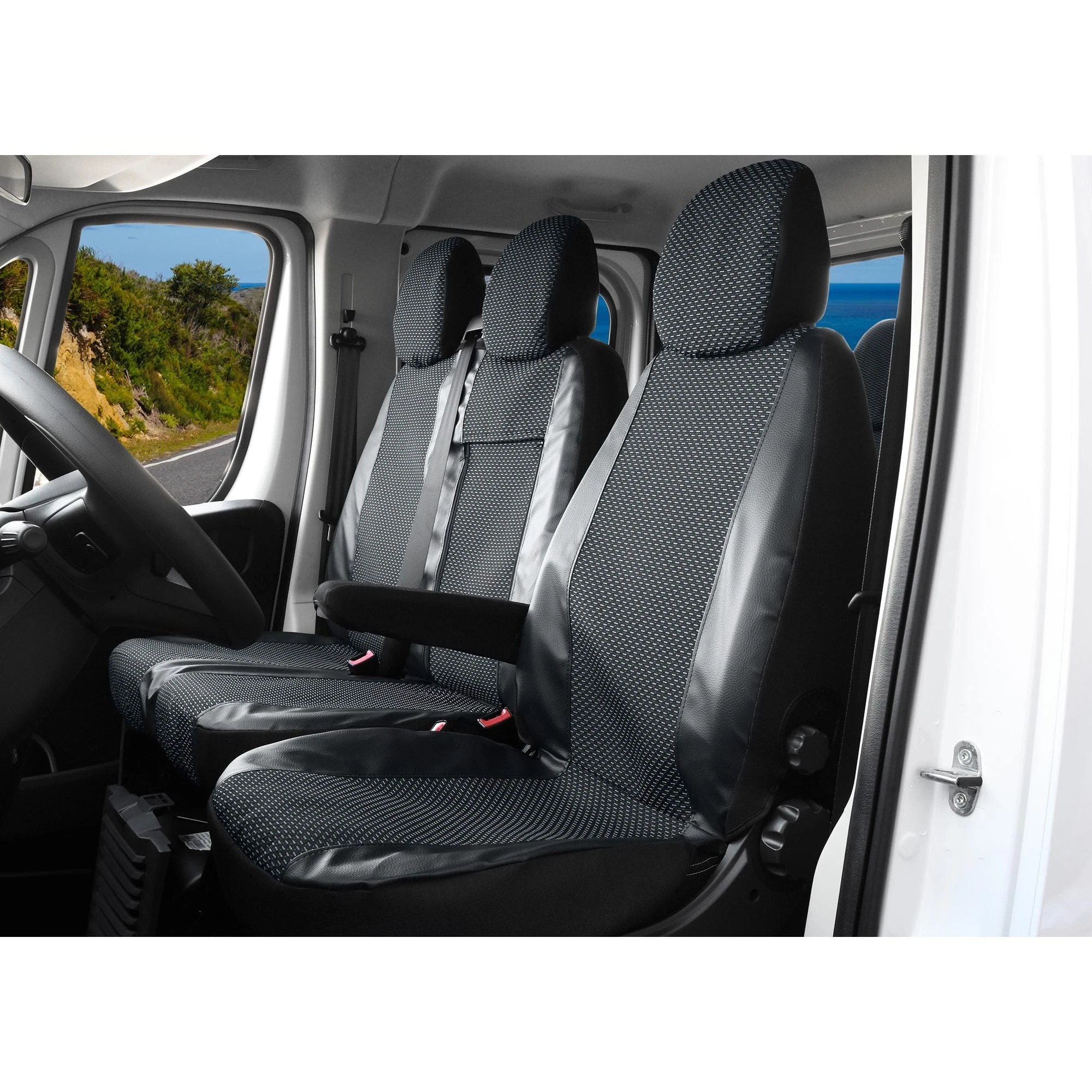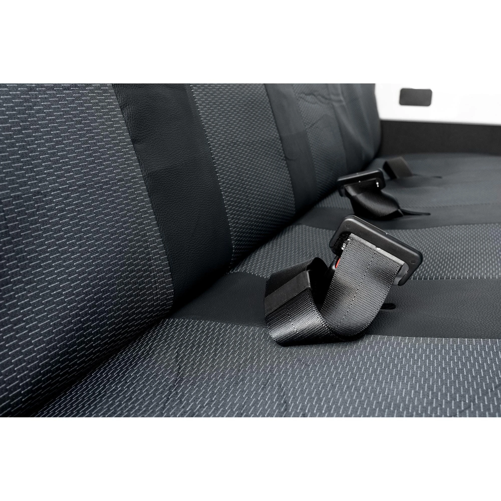 - Rząd przedni (1+2): Pokrowiec na fotel kierowcy oraz podwójną kanapę pasażera. Oparcie pasażera posiada system zamków błyskawicznych, co czyni je kompatybilnym z wersjami wyposażonymi w rozkładany stolik.