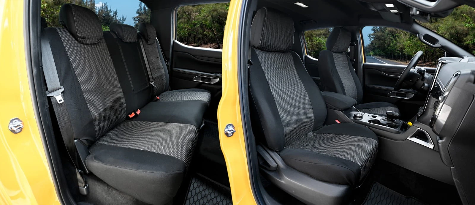 Środkowa część pokrowców wykonana jest z wysokiej jakości żakardu, który charakteryzuje się doskonałą oddychalnością i odpornością na zaciągania. Boki zostały dodatkowo wyściełane i wzmocnione, co nadaje fotelom sportowy sznyt i chroni je przed przecieraniem. Całość została zalaminowana 3 mm pianką poliuretanową, która pełni funkcję stabilizującą – zapobiega przesuwaniu się pokrowców i zapewnia dodatkową miękkość podczas jazdy.