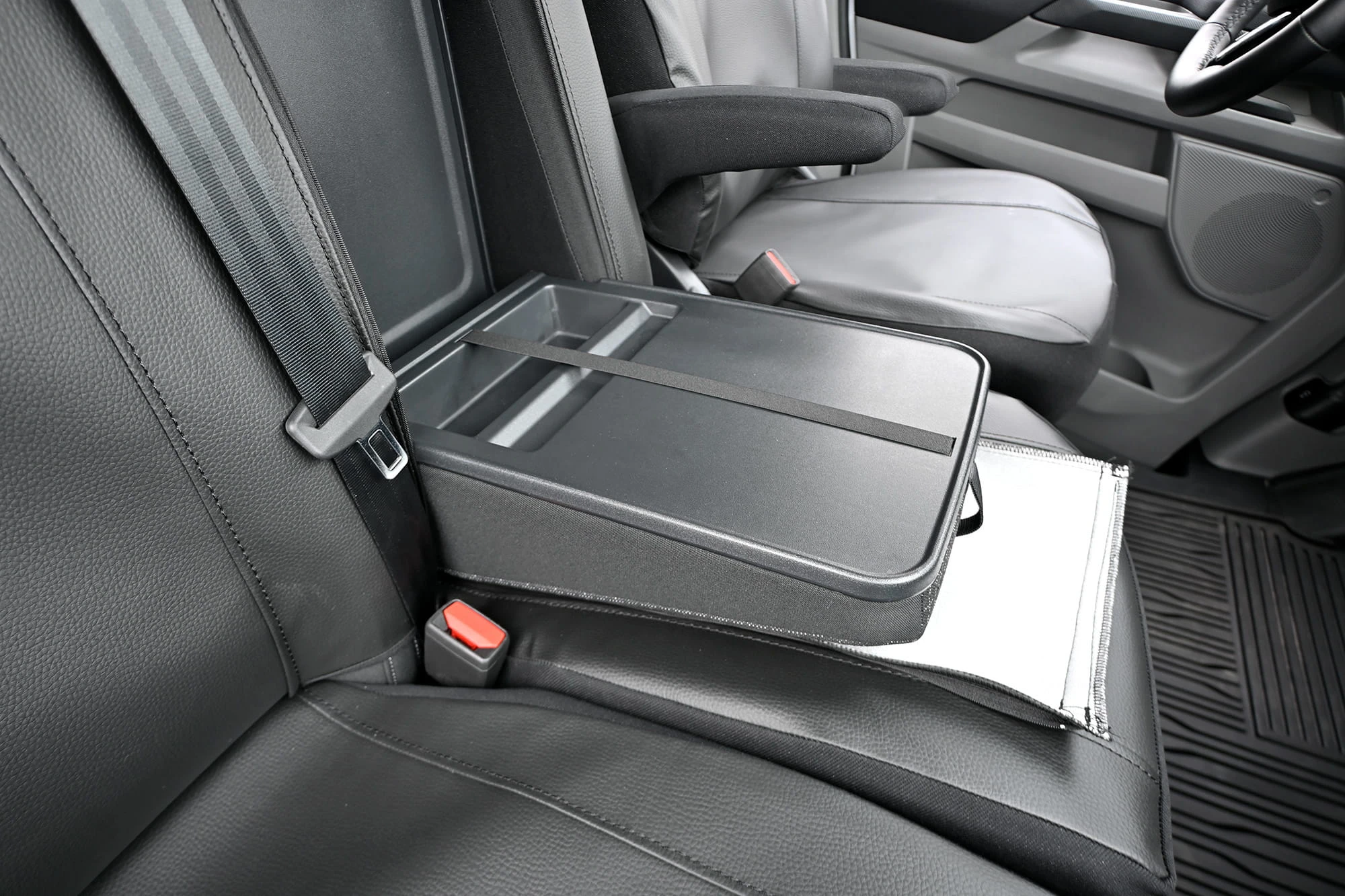 Pokrowce do Volkswagen T7 Caravelle od 2025 - 3 miejsca | Seria MAISTER CAŁE OPARCIE ZE STOLIKIEM 2X PODŁOKIETNIK, SIEDZENIE DZIELONE